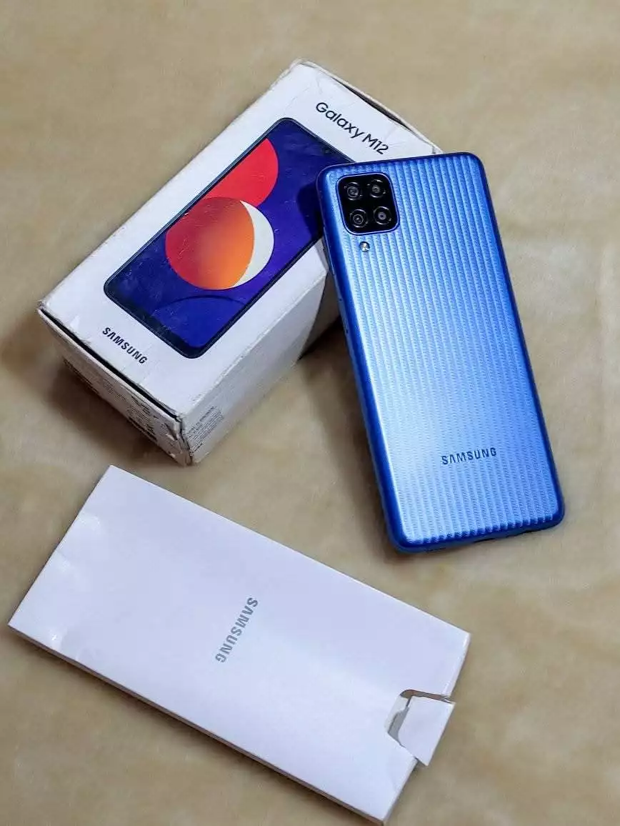 متوفر Samsung M12 بالعلبة شارجار وبوشات يرفد 64/4 GB البطارية 5000 مستعمل 10*10 رقم هاتف 0676911654